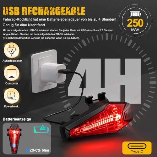 Das Amitor LED-Rücklicht fährt über einen TYPE-C-Anschluss und kann geladen werden. Eine vollständige Ladung hält etwa 4 Stunden ein. Eine Warnanzeige durch eine grünblaue LED verhindert, dass die Batterie leer läuft. Bei einem Akkustand von weniger als 20% leuchtet die grünblaue WarnLED auf. -