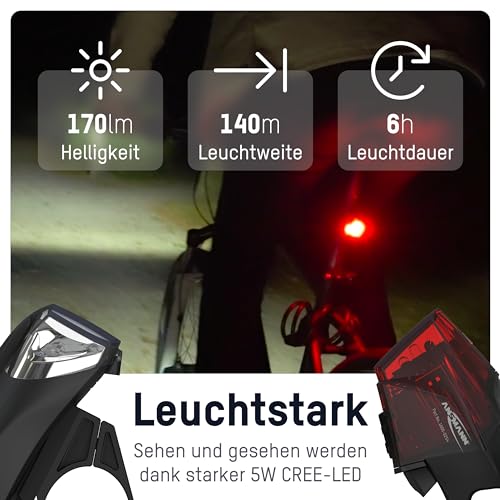 ANSMANN Fahrradlicht Set StVZO zugelassen mit CREE LED / 140 m Leuchtweite 35 Lux 170 Lumen IPX4 Akkubetrieben aufladbar