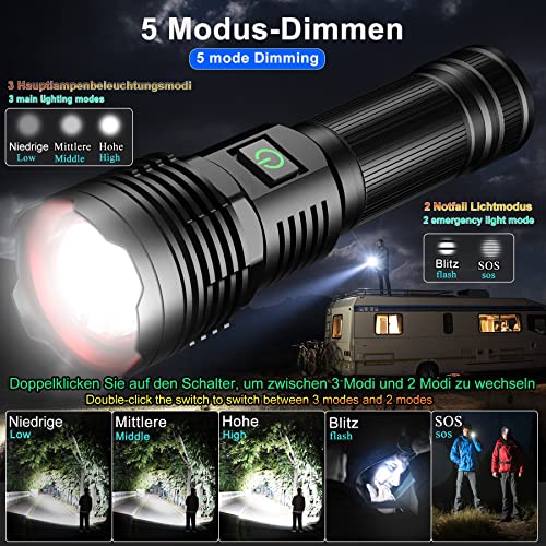 【Bestrahlungserreichung bis 3000 Meter】taschenlampe mit Helligkeit bis zu 30000 Lumen: Der leistungsstarke Strahl erhellt bis zu 3000 Meter entfernt. Fokusieren Sie Objekte leicht und einfach in der Dunkelheit. Perfekt für Outdoor-Aktivitäten wie Wandern, Jagd, Camping, Angeln oder Notfälle.