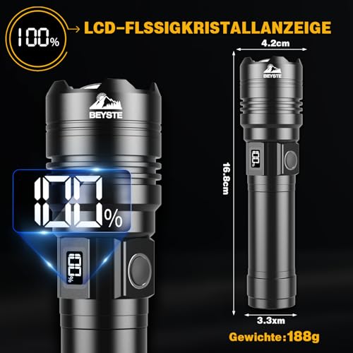 Mit einer LCD-Leistungsanzeige auf der Seite können Sie das Lichtleistungsprofil jederzeit einsehen. Die Gestaltung ist optimiert, um eine komfortable Erfahrung beim Halten zu bieten. Diese Taschenlampe ist perfekt für Outdoor-Aufenthele, Spaziergänge, Camping und ähnliche Situationen.