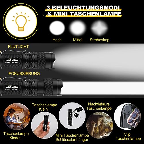 Die LED Taschenlampe enthält eine kleine Taschenlampe mit einer Helligkeit von 800 Lumen, einem Gewicht von nur 42 g (betrieben mit AA-Batterien) und drei Modi (hoch/niedrig/Stroboskop). Sie ist 90 mm lang und trägt einen Clip, um sie als Schlüsselanhänger Lampe zu verwenden, und kann in Ihrem Rucksack, Tasche, Handtasche oder Auto aufbewahrt werden. Sie ist auch eine tolle Taschenlampe, um Kinder durch die Nacht zu begleiten.