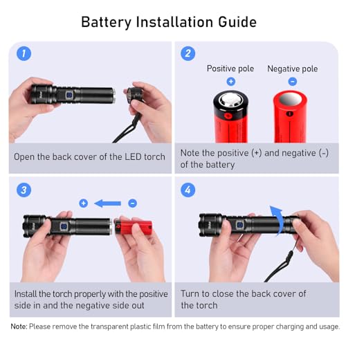 Drücken Sie den Schalter 3 Sekunden lang, um ihn auszuschalten, oder nach 8 Sekunden, um einen starkeren Ausstand zu erhalten. Die Taschenlampe speichert automatisch den zuletzt verwendeten Lichtmodus. Im Lieferumfang befinden sich: 1 Wiederaufladbare Batterie, 1 Batteriehalter, 1 Batterierohr, 1 USB-C Ladekabel, 1 Box, 1 Trageband, 1 Taschenlampenholster, 1 Mini Taschenlampe und 4* Wasserdichter Dichtungsringe.