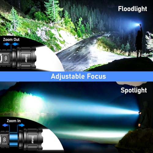Die LED-Taschenlampe verfügt über 5 Lichtmodi: Superhell, Normal, Weich, Strobe und SOS, um sich an verschiedene Nutzungsszenarien anzupassen. Sie ist auch zoombar, sodass Sie zwischen Flut- und Spotlight auswählen können, um in die Ferne oder in die Nähe eine klare Sicht zu haben.
