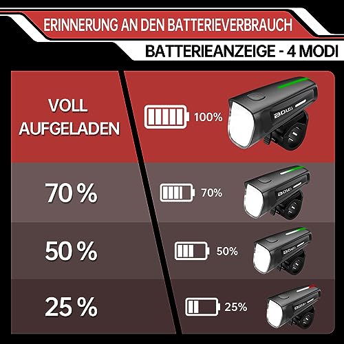Hochwertige Wasserdichtigkeit: Das Fahrradlicht hat eine IPX5-Wasserdichtigkeit. Bitte beachten Sie, dass das Rad in starkem Regen nicht gefahren werden sollte. Durch den typ-C-Ladeanschluss können Sie Ihre Batterie sicher und mit längerer Akkulaufzeit aufgeladen werden.