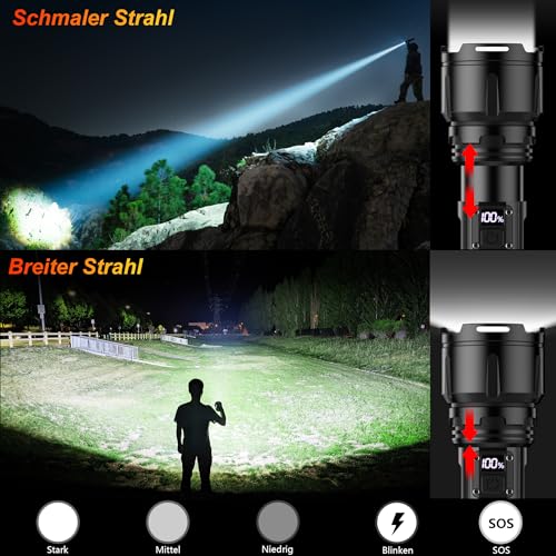 - Fokussierung und mehrere Lichtmodi: 5 Lichtmodi: Hoch, Mittel, Niedrig, Strobe und SOS.