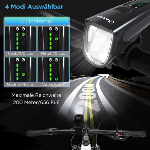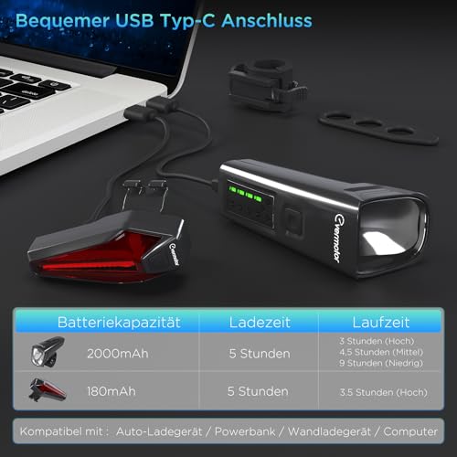 - Die Frontleuchte läuft bis zu 9 Stunden im Niedrigmodus, die Rückleuchte 3,5 Stunden.