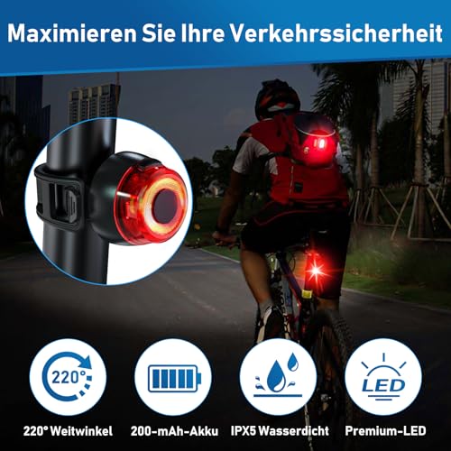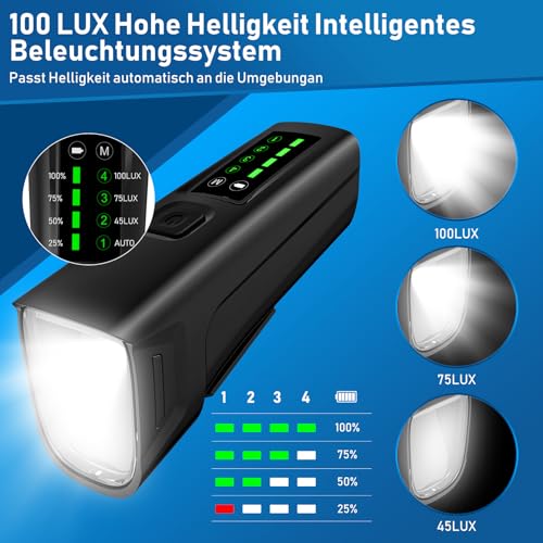 IDEAL ANPASSBAR: Mit maximaler Helligkeit von 100 LUX bietet dieses Fahrradlicht eine herausragende Sichtbarkeit in der Nacht. Der integrierte Lichtsensor passt das Lichtautomatisch Helligkeitsstufen an, oder Sie können es manuell auf 100 LUX, 75 LUX oder 45 LUX einstellen.