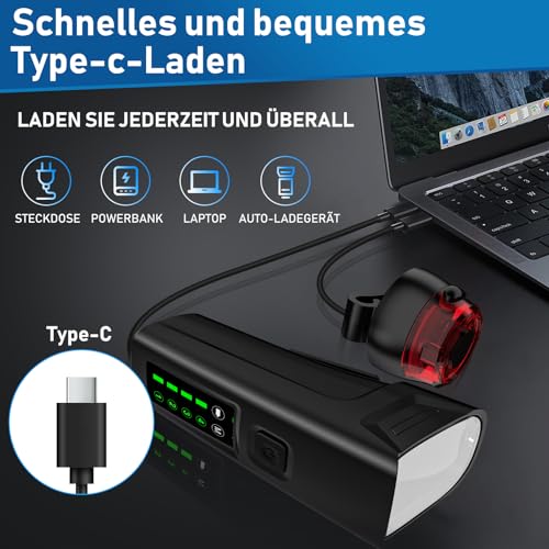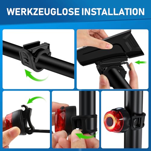 IPX5 wasserdicht und werkzeuglose Installation: Das fahrradlicht ist IPX5 wasserdicht und kann ohne Werkzeug montiert und demontiert werden. Es ist robust und langlebig, ideal für verschiedene Umgebungen. Bitte vermeiden Sie jedoch die Nutzung bei starkem Regen.