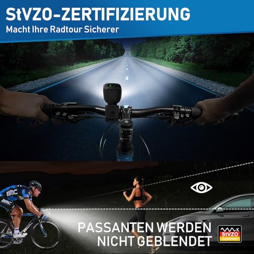 Blendfreies optisches Design: Das STVZO Fahrradlicht verfügt über ein blendfreies optisches Design und ist von STVZO zertifiziert. Dies verhindert das Blenden von entgegenkommenden Fußgängern oder Autofahrern und ermöglicht sichereres Fahren.