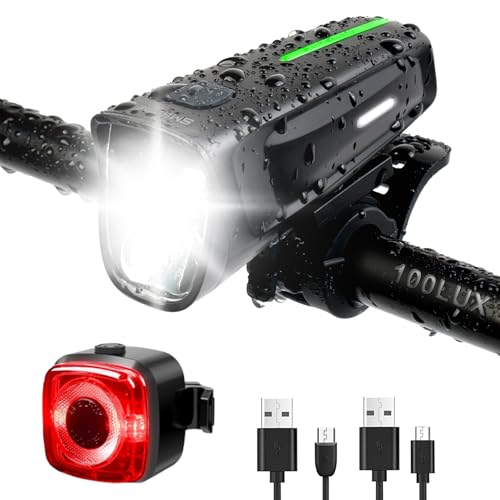 Lassen Sie die zwei Fahrradlampen mit Micro-USB-Steckverbindungen aufzuladen, was den Anschluss an eine Steckdose, einen Computer oder eine mobile Stromquelle erleichtert. IPX5-Wasserdichtigkeit sorgt für bestmögliche Protektion. Fahren Sie besser nicht bei starkem Regen.