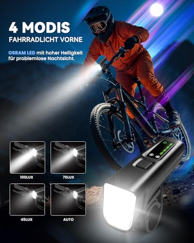 Unser vorderes Fahrradlicht verwendet Osram-LEDs, einen 2000-mAh-Lithium-Ionen-Akku und bietet drei Helligkeitsmodi: Hoch (100 LUX)/Mittel (70 LUX)/Niedrig (45 LUX)/Automatisch (AUTO). Der intelligente Automatikmodus passt die Lichtintensität automatisch an die Umgebungshelligkeit an, was den Bedienungsaufwand minimiert und Ihnen mehr Vergnügen bei der Fahrerei ermöglicht. Noch nie war Nachtfahren so clever und gezielt.