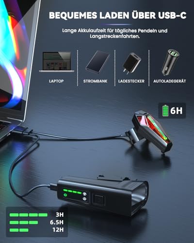 Ihr Fahrradlicht-Set ist einzigartig durch einen USB-C-Aufladegerüster, den es Ihnen ermöglicht, in jeder Umgebung schnell und bequem zu laden. Entspannen Sie sich, ob Sie es an einen Computer, eine Steckdose oder einen mobilen Stromadapter anschließen.
