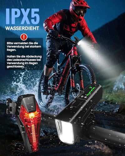 Unsere Fahrradzubehör-Sicherheitsleuchten sind alle IPX5-wasserdicht und bieten eine stabilere Beleuchtung auch in feuchten Umgebungen. Für die beste Sicherheit sollten Sie aber nicht in starker Regenfälle fahren. Die Werkstofflose Installationsrichtlinie und Zubehör im Paket bedeuten, dass Sie in wenigen Minuten einwandfrei installieren können. Mit dem Schnellverschraubungsdesign können Sie die Lampen leicht entfernen zur Aufladung oder zum Sichern vor Diebstahl.