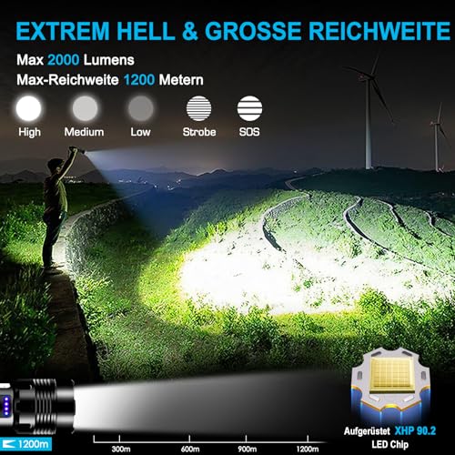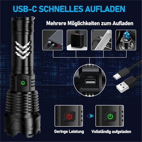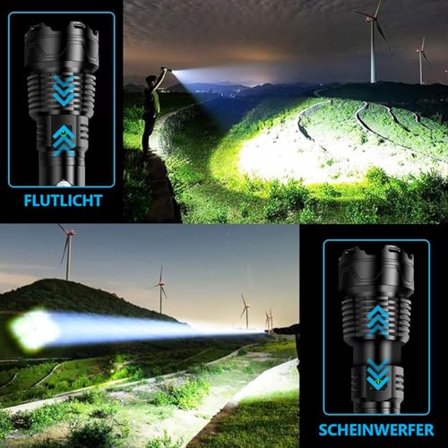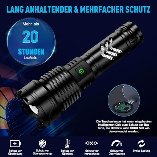 【Extrem hell & längere Leuchtdauer】Glarylight Taschenlampe verfügt über einen verbesserten XH-P160.8 Chip undSUPER helle PERLEN, die eine Helligkeit von 500.000 Lux und eine LEUCHTWEITE von 300m bis 1200m bieten. ContrAST zu anderen 3000mAh Taschenlampen, wurde nuestraUflladbare Glarylight-Taschenlampe in eine 5000mAh große KapazitätBATTERIE gebaut, bietet mehr als 20 STUNDES Leuchtdauer und entbehrtSie häufigen AUFLADENS.