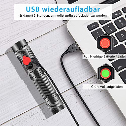Wiederaufladbare Ledetaschlampe über USB: Diese Lampe wird mit einem wiederaufladbaren Akku ausgestattet. Sie kann mit einem USB-Kabel oder via Netzteil von einem Laptop, einem Autoladegerät, einer Powerbank oder ähnlichen Geräten aufgeladen werden. Grünes Licht bedeutet, dass die Lampe vollständig geladen ist. Rot bedeutet, dass die Batterie schwach ist.