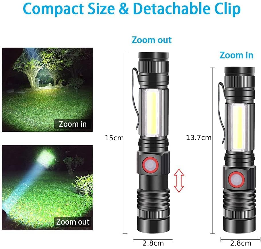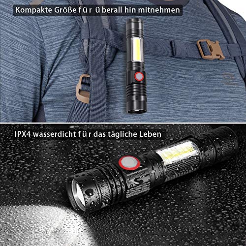 Taschenlampe LED, aufladbar mit 4 Modi: Diese leistungsstarke Ledertaschenlampe gibt es in verschiedenen Modus: Hoch, niedrig, COB-Seitenlicht und SOS. Halten Sie die Taste 1 Sekunde lang, um sie in jedem Modus auszuschalten. Perfekt für den Heimgebrauch, zum Gassigehen mit Ihrem Hund, zum Angeln oder für mechanische Inspektionen.