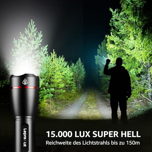 Mit der ultrahellen LED-Taschenlampe auf einem P9-Chip erreichen Sie eine Lichtstärke von 15.000 Lux und eine maximale Reichweite von 250 Metern. Das robuste Metallgehäuse bietet hervorragendes Schutz und ideal für Outdoor- und Notfallzwecke.