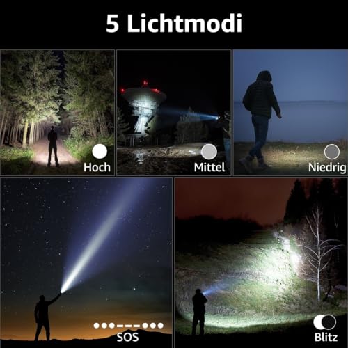 Mit 5 verschiedenen Beleuchtungsmodi – von hoch bis niedrig, Blitz und SOS – passt diese Taschenlampe zu Ihren verschiedenen Anforderungen. Die Leuchtweite kann durch simple Drehmanöver des Kopfes eingestellt werden.