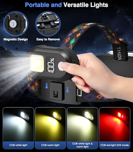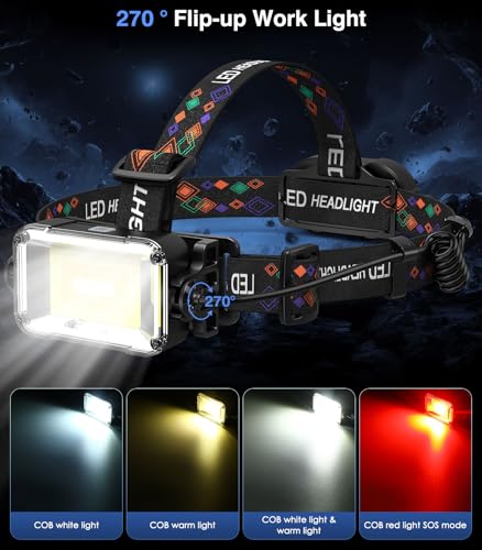 Die Stirnlampe bietet mehrere Lichtmodi, einschließlich warmes Ligts, weisses Licht und rotes Licht, sowie SOS-Modi. Ein eingebautes empfindlicher Sensor ermöglicht es, den Sensormodus einzuschalten, umFlexible Beleuchtung an Ort und Stelle zu erreichen.