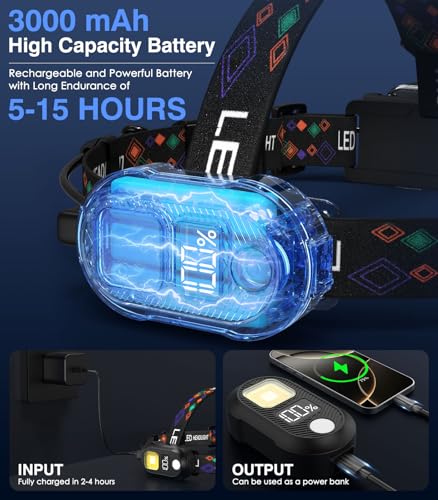 Mit einer 3000-mAh-Akku bietet die Camping-Stirnlampe eine hohe Kapazität und eine lange Nutzungsdauer. Sie kann in nur 2-3 Stunden vollständig aufgeladen werden und wird in verschiedenen Beleuchtungsmodi bis zu 15 Stunden lang hält.