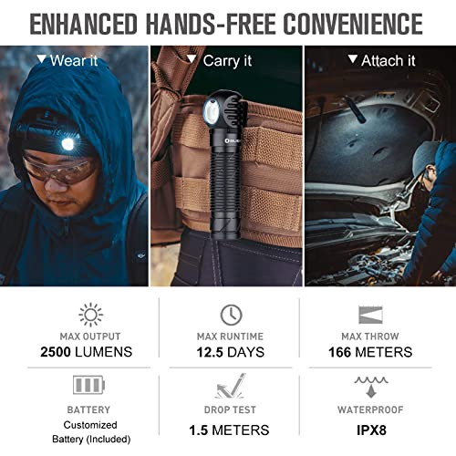 [Multifunktionelle Kopflampe] Die Kopflampe ist nur 161 Gramm schwer und kann als Taschenlampe oder mit dem Olight-Stirnband auch als Stirnlampe verwendet werden. Sie kann um 180 Grad gedreht werden, sodass das Licht exakt auf die gewünschte Position gerichtet werden kann.