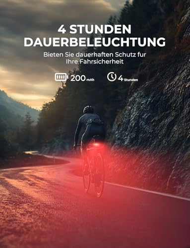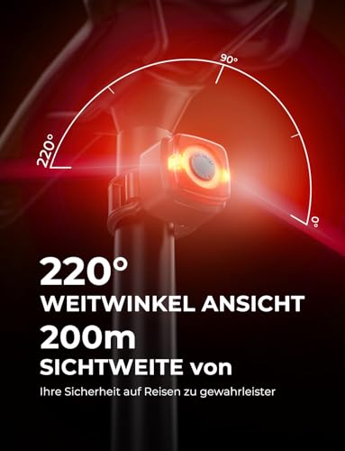 Dieses Radrücklicht hat eine Sichtweite von bis zu 200 Metern und einen Sichtwinkel von 220°, was Sie stets gut sichtbar macht. Die seitlichen LEDs erhöhen die Warnwirkung perfekt für Fahrten in der Dämmerung oder bei schlechten Lichtverhältnissen.