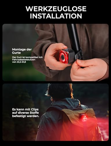 Das elegante Clip-Design erlaubt eine einfache Installation mit einem Silikonband oder als Clip, beides ohne Werkzeug. Das Radlicht passt zu Fahrrädern, Scootern, Rucksäcken oder dem Geschirr Ihres Hundes. Die Einsatzmöglichkeiten sind vielfältig und benutzerfreundlich.