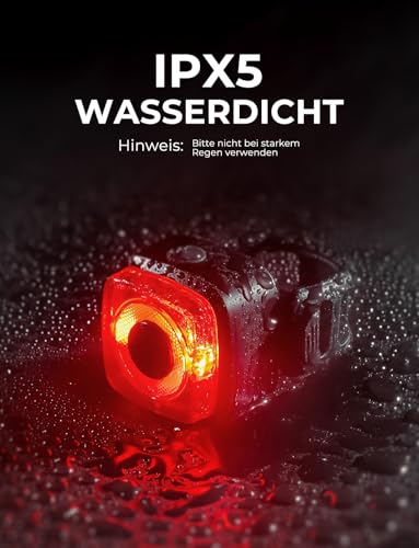 Dank der IPX5-Wasserfestigkeit ist unser Radlicht robust und hält bei Regen die Elemente stand. Es bietet zuverlässigen Schutz auch unter widrigen Wetterbedingungen. Allerdings sollten Sie es bei extrem starkem Regen nicht verwenden, um die Lebensdauer zu verlängern.