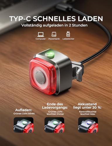 Die intelligente USB-C-Ladefunktion sorgt dafür, dass das Radrücklicht in nur 2 Stunden aufgeladen wird und eine Nutzungsdauer von bis zu 4 Stunden bietet. Ein integriertes blaues Licht signalisiert, wenn der Ladezustand unter 20 % fällt, sodass Sie rechtzeitig aufladen können.