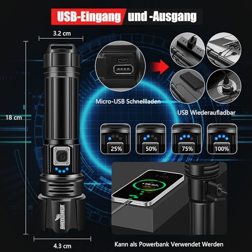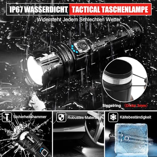 EU-Patent: Das Shadowhawk Taktik-Torpedo mit dem Chip P70.2 hat 10.000 Lumens. Verglichen mit einer normalen Torche sind das Lichtstrahlen 10 Mal heller. Ein Raum von 120 m² kann leicht beleuchtet werden, und du kannst Objekte bis zu 500 Metern entfernt einfangen. Ideal für Außeneinsätze, Wanderungen, Camping, Fischfang, Notfälle und perfekt als Geschenk für Männer.