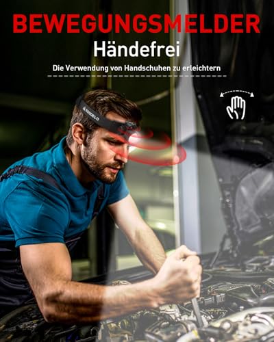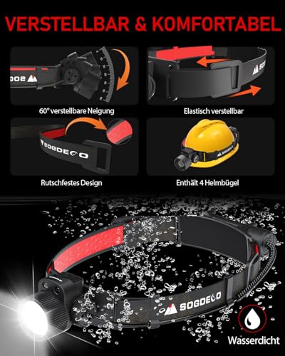 Super hellige Lampe mit 5 Licht- und 5 Sensormoden: Der Sogdeco-Headlamp bietet bis zu 10.000 Lumens Super-Helligkeit. Dies ermöglicht, bis zu 500 Meter weit zu sehen (1640 Fuß). Der Lichtwechsel zwischen den fünf Moden, einschließlich SOS- und Strobe-Modus, sorgt bei jedem Notfall für Sicherheit. Die Sensorfunktion per Bewegung ermöglicht es Ihnen, die Lampe einfach mit einer Handbewegung einzuschalten und auszuschalten.