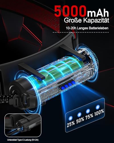 Einfache und schnelle Ladung sowie langlebige Dauer: Mit einem 5000 mAh Lithium-Ion-Batteriespeicher und Type-C-Wechselausgang kann der Sogdeco Headlamp bis zu 20 Stunden Nachtmodus laufen. Dies deckt Ihren ganzen Wochenendausflug ab. Die längstmögliche Betriebsdauer und die gemütliche Ladung erleichtern Ihnen das Leben und sind umweltfreundlicher und wirtschaftlicher als andere Batterieleuchten.