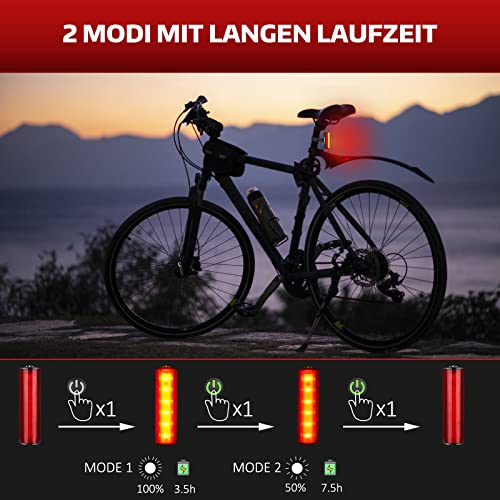 🚴 2 Helligkeitsmodi & Langlaufzeit — Das Rücklicht hat 2 Modi, aus denen der Benutzer die Dunkelheit der Straße wählen kann. Mit hoher Batteriekraft kann es bis zu 7,5 Stunden beleuchten, was zusätzliche Sicherheit bietet.