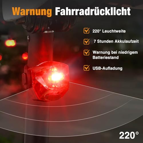 Das toptrek Hinterradlicht besitzt eine Akku-Ladekapazität von bis zu 300 mAh und braucht nur eine Stunde zum vollständigen Aufladen. Die Lichtdauer betrug bis zu 7 Stunden und sorgt für eine lange Akku-Ladezeit, um Ihren Verkehrssicherheit zu gewährleisten. Der breite Winkel der Beleuchtung wird leichter von anderen Straßenbenutzern wahrgenommen und sichert eine sichere Entfernung.