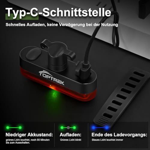 Das Fahrrad Rücklicht unterstützt das Laden über USB-C mit einer Akkukapazität von 400 mA. Es kann 6 Stunden lang ununterbrochen leuchten, ohne dass ein häufiger Batteriewechsel erforderlich ist. Das spart Kosten und ist praktisch.