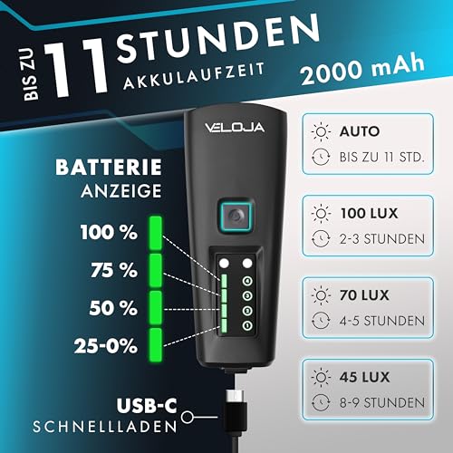 Das Frontlicht verfügt über einen leistungsstarken 2000-mAh-Akku, der je nach gewähltem Leuchtmodus bis zu 11 Stunden hält. Das Rücklicht bietet bis zu 4 Stunden Laufzeit. Beide können per mitgeliefertem USB-C-Kabel aufladen.