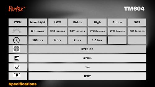 [Hohe Lumen] TM604 ist mit einer 1* Hochleistungs-LED und einem glatten Reflektor ausgestattet. Dadurch bietet es eine hohe Helligkeit von 1800 Lumen. Der Lichtstrahl ist außerdem sehr weit. Diese Konfiguration maximiert die Beleuchtungsleistung der Taschenlampe.