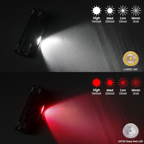 Helle kopflampe mit rotlicht: Diese LED-Stirnlampe ist mit einer LH351D und einer Luminus SST20 LED ausgestattet und liefert eine maximale Leistung von 500 Lumen. Mit 4 verschiedenen Modi: niedrig, mittel, hoch, Turbo. Die 5000K 90 CRI LED sorgt für eine bemerkenswerte Farbwiedergabe und einen schönen, komfortablen weißen Strahl. Rotes Licht mit einer Wellenlänge von 661 nm schützt Ihre Nachtsicht und erhält Ihre periprale Sicht gut.